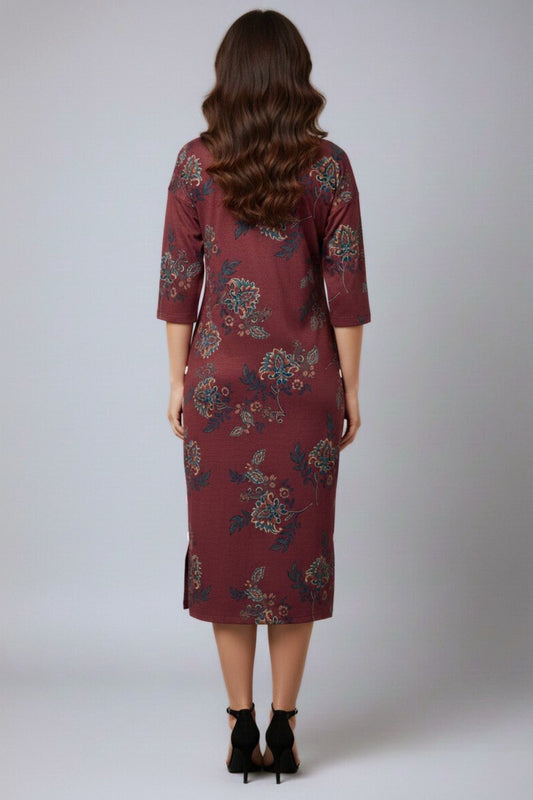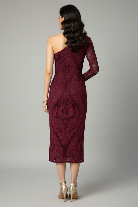Velvet Burnout One-Shoulder Maroon Midi Dress