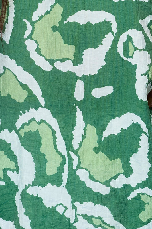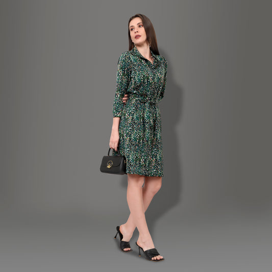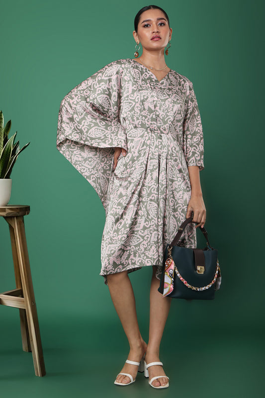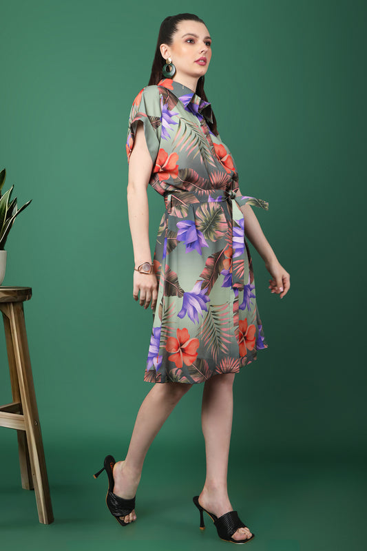 Tropical Green Floral Print Dress with Waist Tie Detail