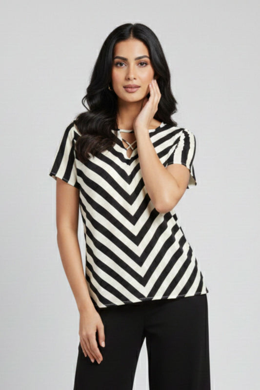 Criss Cross Neck Striped Top – Black & White | Silk Blend
