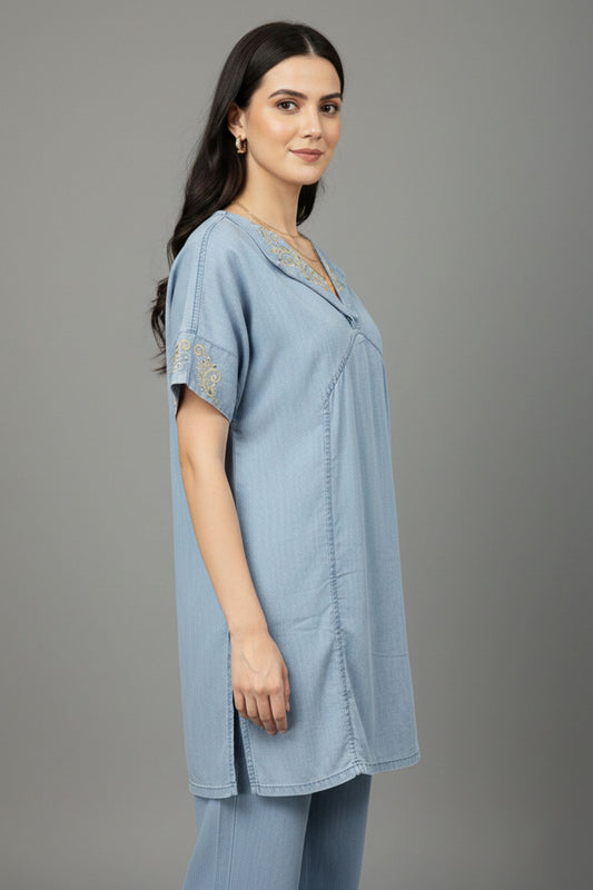Short Sleeves Embroidered Tunic - Blue | Lyocell Denim