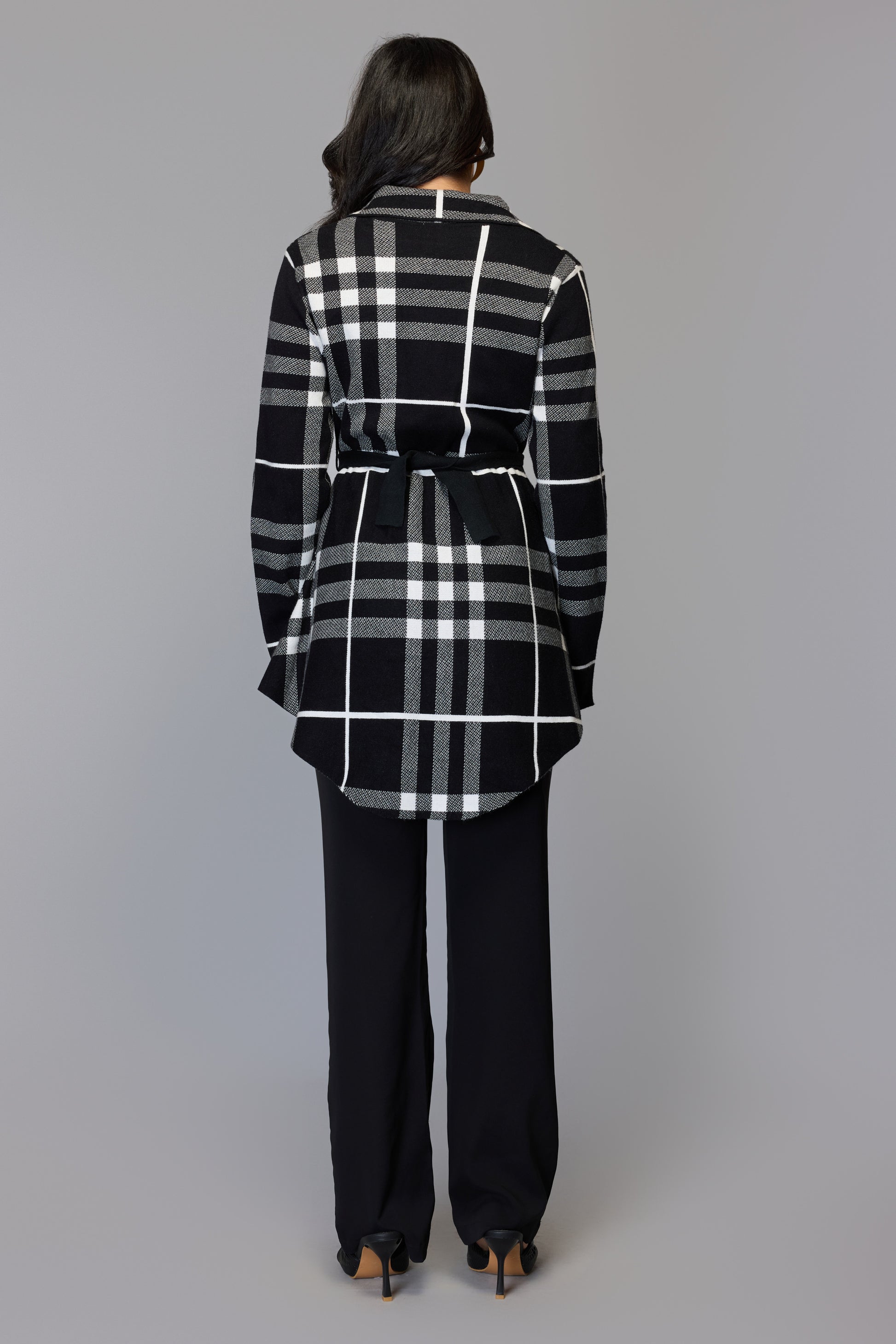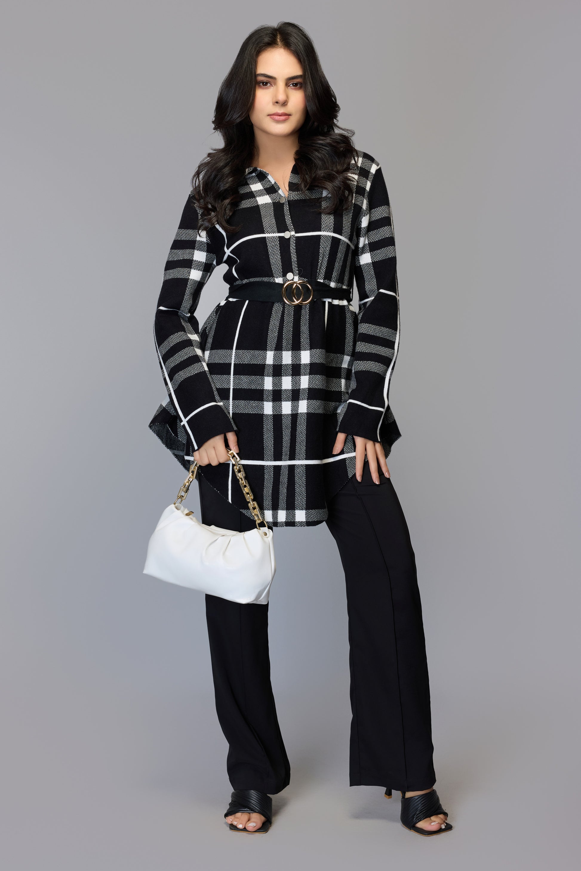 Step out in timeless elegance with our Black and White Tartan print Long Jacket, a wardrobe staple that combines classic design with modern functionality. Featuring an iconic tartan pattern, this jacket exudes sophistication, while the adjustable belt allows you to tailor the fit for a flattering silhouette. The longline design offers both warmth and style, making it perfect for layering over casual or formal outfits