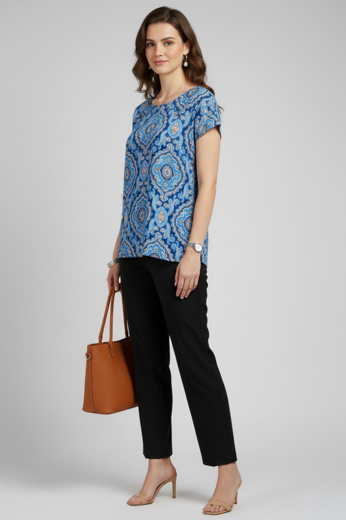 Channel timeless elegance with a touch of ethnic flair. This blue short-sleeved top from TAMiSKA By Narendra Kumar features an all-over paisley motif reminiscent of traditional Indian prints. Crafted in soft polyester, the top boasts a gentle sheen and smooth finish, with a curve-cut hem that flatters all body types.