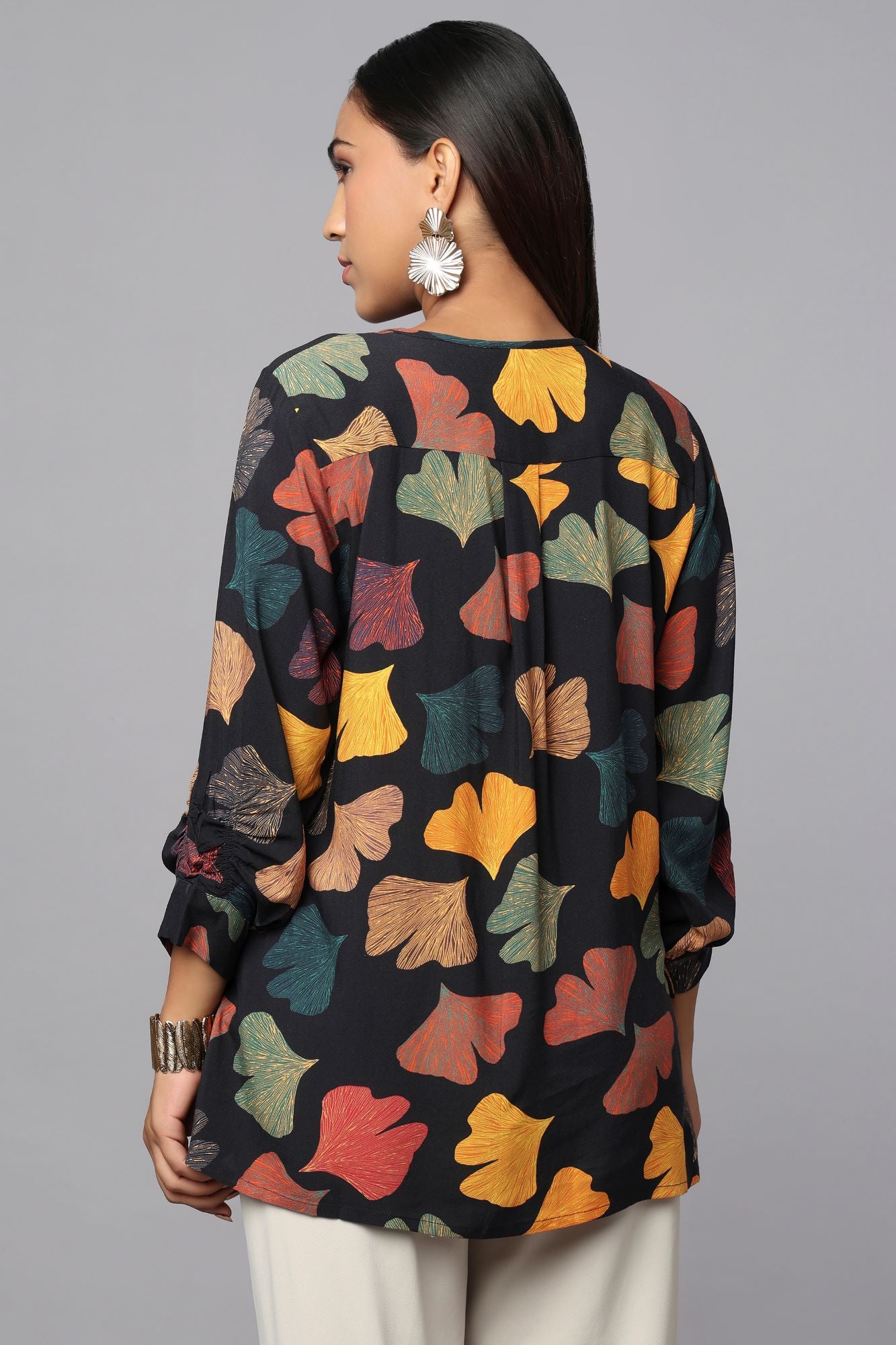 Let your wardrobe take root in bold botanicals. This eye-catching viscose blend top from TAMiSKA By Narendra Kumar features a statement ginkgo leaf print in warm autumn tones set against a deep black base. Designed with a relaxed silhouette and full-length sleeves, it flatters with ease while adding drama to your everyday look.