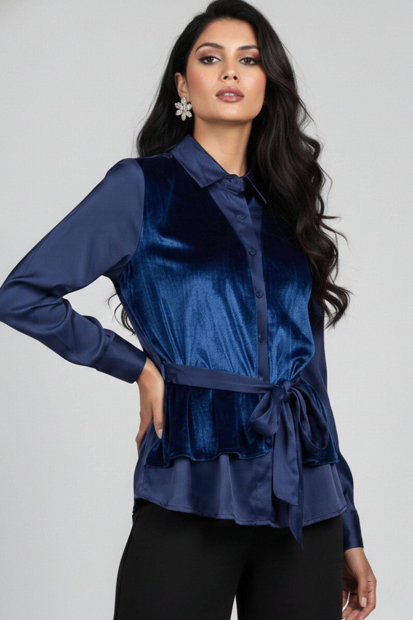 Elegant with a soft statement finish. This navy blue top combines a smooth shirt base with a plush velvet front panel, creating a rich play of textures. The structured collar and button-down design keep it refined, while the velvet adds depth and a subtle evening-ready shine.