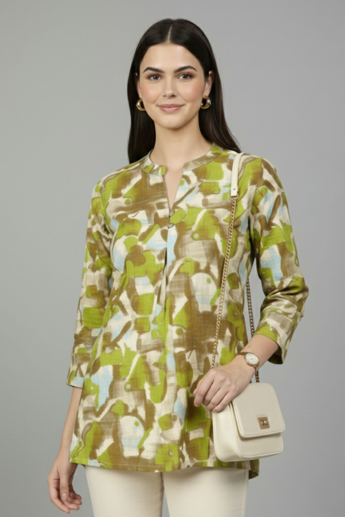 An effortless blend of elegance and artistry, this tunic features an abstract brushstroke print in earthy greens and soft neutrals. Crafted in a soft viscose blend, the fabric has a natural drape and lightweight feel, perfect for long days at work or relaxed evenings out. The silhouette is a straight cut with soft side flares that give a gentle structure without clinging. The neckline combines a rounded collar with a subtle front slit and a single-button closure, balancing modesty with a modern edge.
