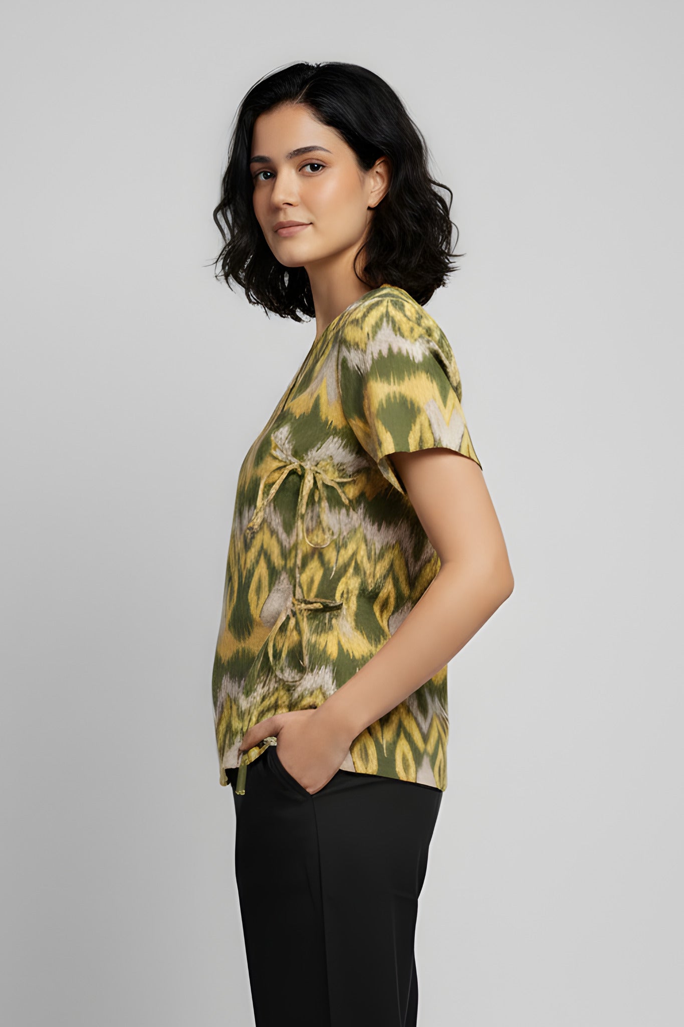 This versatile green printed top from TAMiSKA By Narendra Kumar brings together artisanal patterns and effortless tailoring. Crafted from a soft viscose blend, it features a flattering V-neckline and functional side tie-up closure that cinches the waist for a custom fit. The subtle sheen of the fabric and the ikat-inspired print in deep green tones add a touch of craft-inspired texture, making it perfect for both casual outings and elevated everyday dressing.