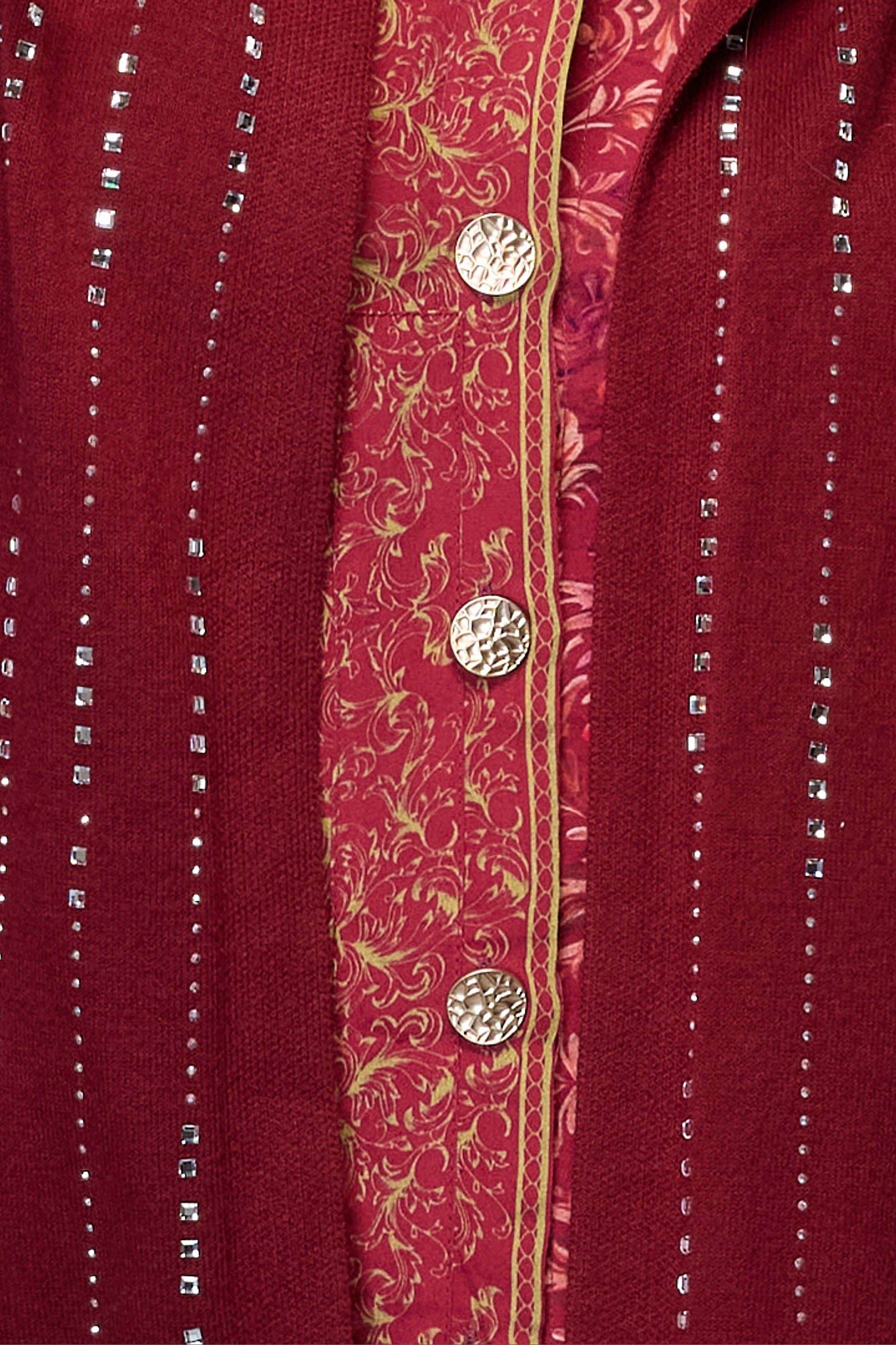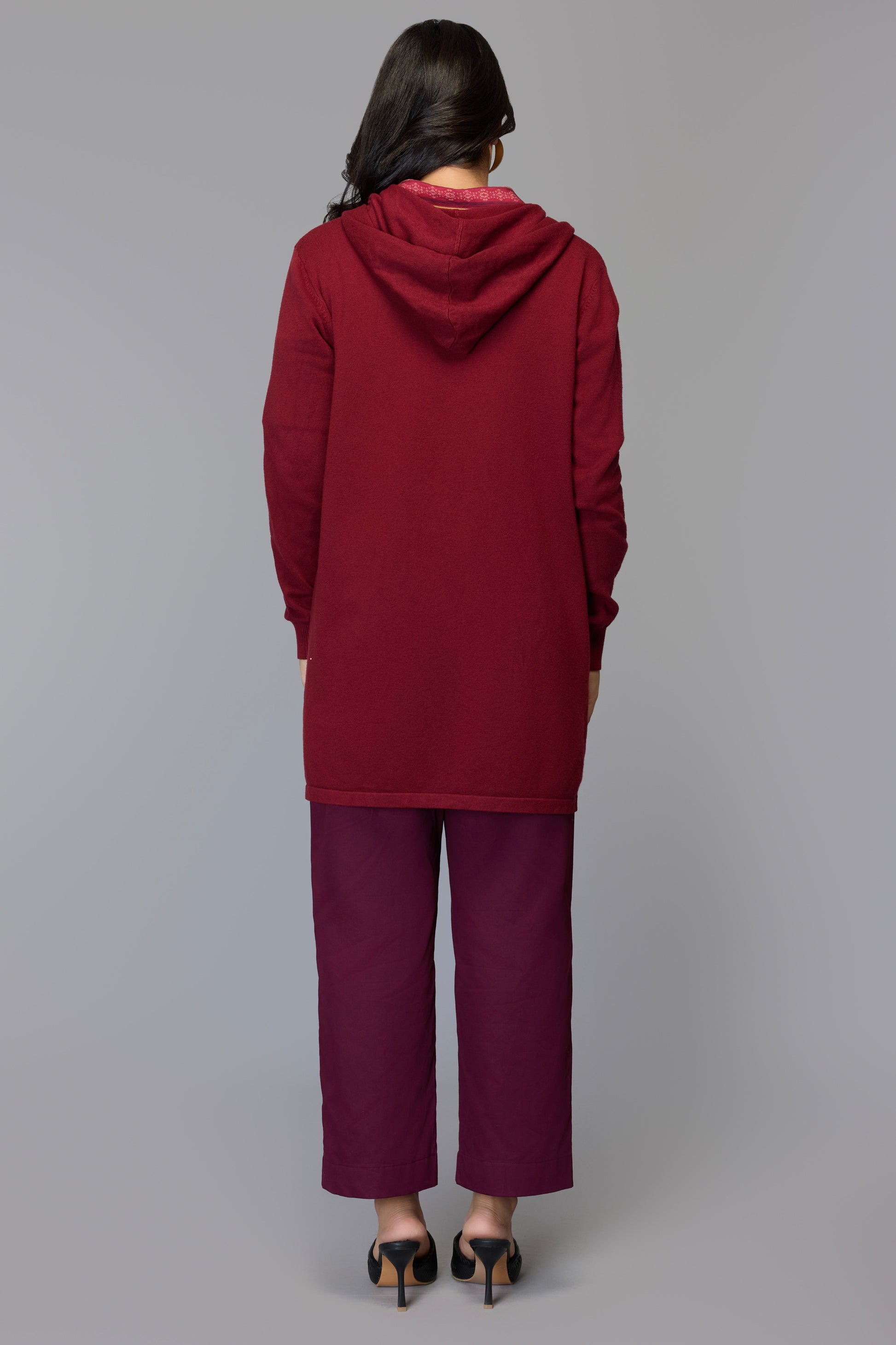Crafted in a soft viscose blend knit, it features an elongated silhouette perfect for layering during transitional weather. The front panel is delicately adorned with mirror-style embellishments that shimmer subtly, while the hoodie and patch pockets add a casual charm.
