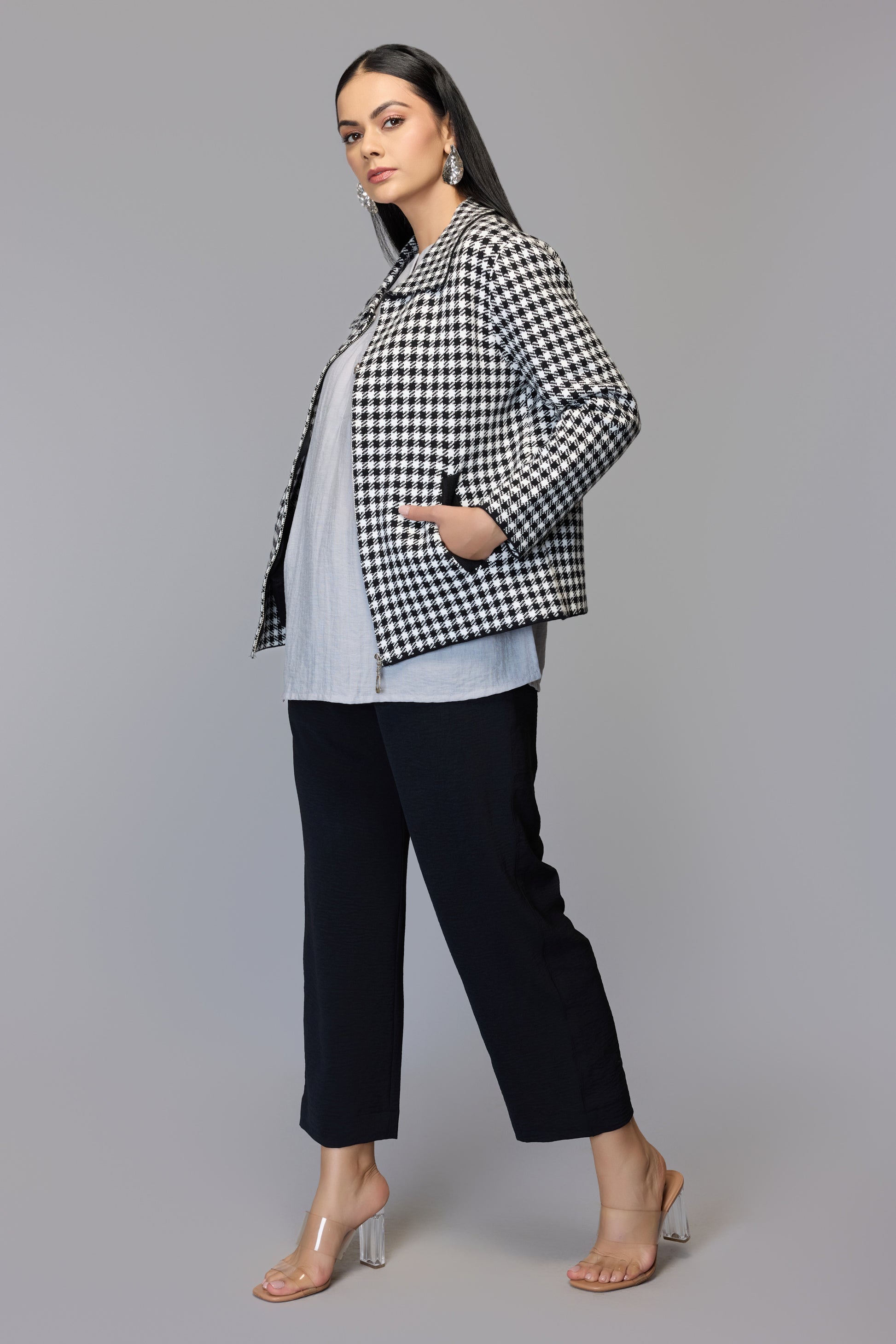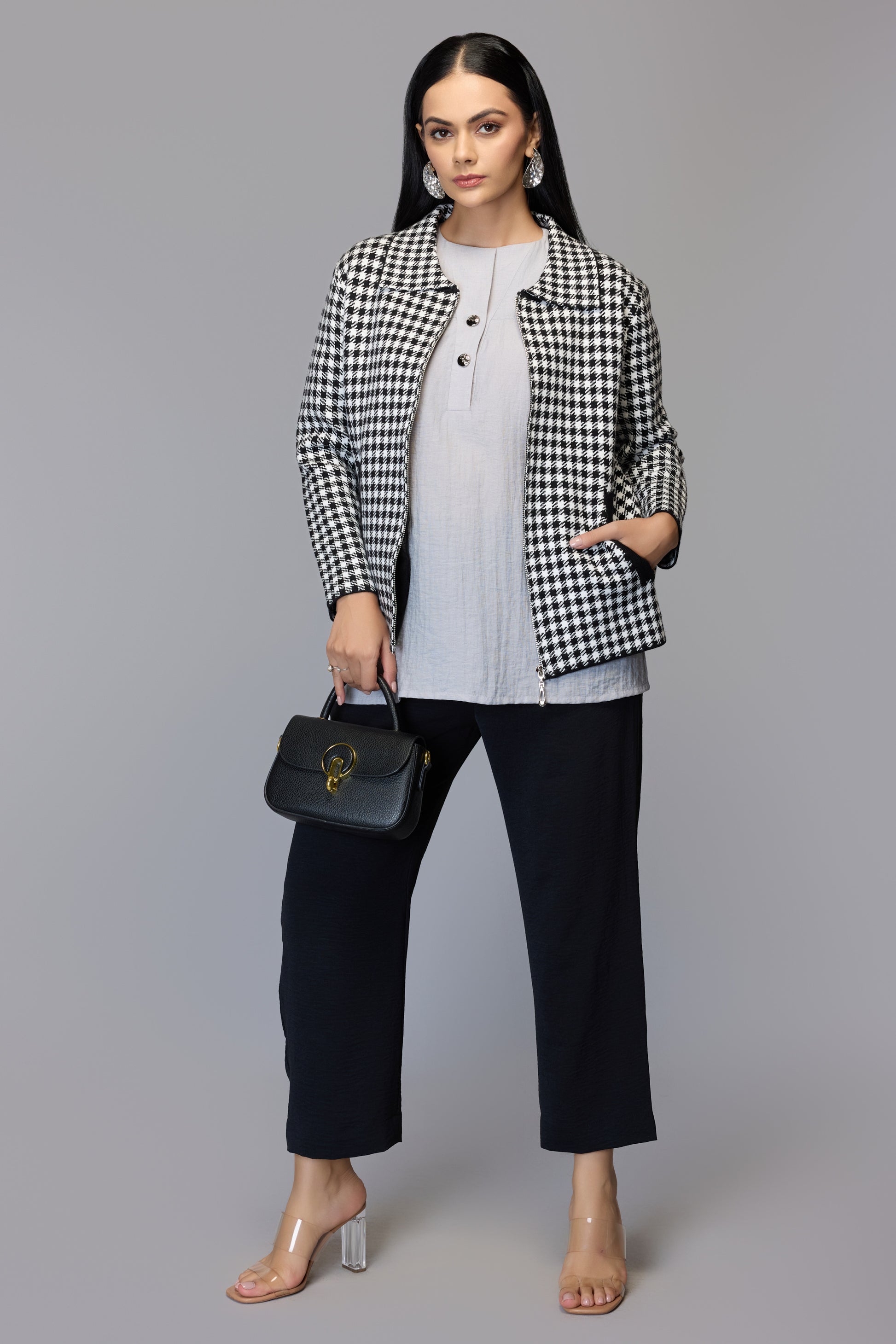 Timeless and chic, this zip-up jacket brings a vintage edge to your wardrobe with its bold houndstooth weave and crisp collar. Crafted in a soft viscose-blend knit, it offers structure with comfort—perfect to layer over solids or wear with denim for effortless style. Side pockets and a clean front zipper add function to the fashion.