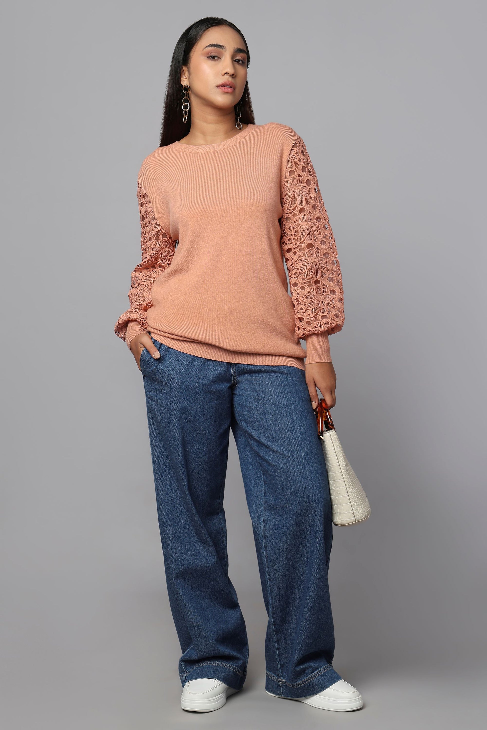 Elevate your everyday winterwear with this elegant sweater from TAMiSKA By Narendra Kumar. Designed in a soft viscose blend, this sweater combines classic knitwear structure with feminine lace sleeves that add a touch of romance. The floral lace detail gently cascades down the full-length balloon sleeves, while the body remains clean and understated. Perfect for layering or wearing solo, this versatile silhouette transitions effortlessly from casual to dressed-up days.