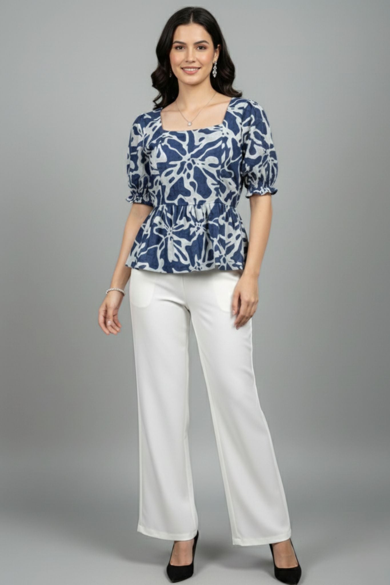 This blue peplum top from TAMiSKA By Narendra Kumar blends comfort, structure, and sustainability in one refined design. Made from Lyocell denim, a soft and eco-friendly fabric, the top feels breathable and smooth against the skin. It features a flattering square neckline, statement puff sleeves with gentle gathers, and a peplum flare that enhances the waistline. The all-over abstract floral print adds a fresh, modern touch, making it perfect for both daywear and smart casual occasions. Style it with trousers, jeans, or skirts for an effortlessly polished look.