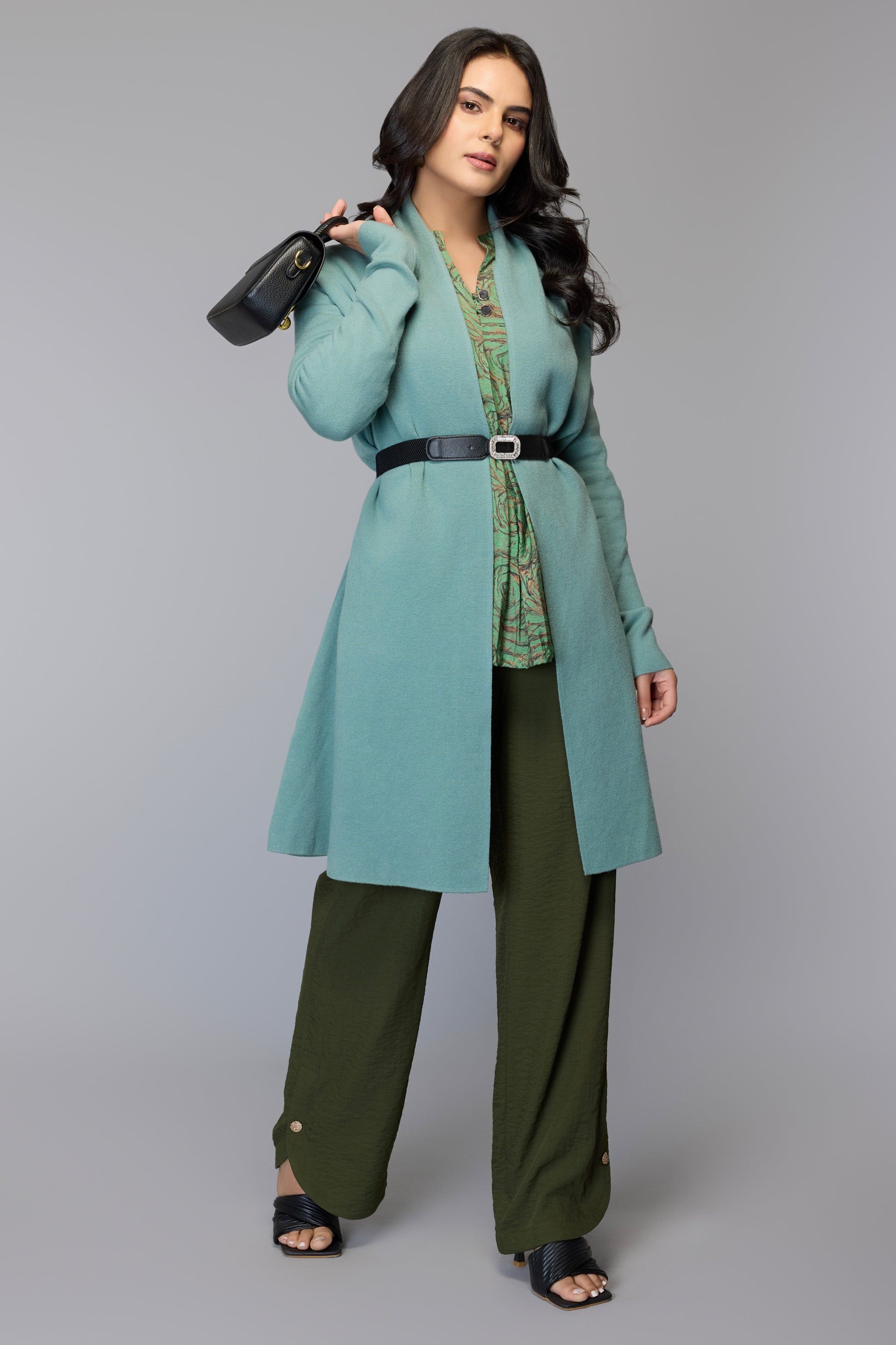 Elevate your winter layering with this sophisticated longline sweater. Designed in a flattering silhouette, it features a high neck, open front, and a flowy flare that drapes beautifully over your frame. The built-in stretch waistband gathers gracefully at the waist, further enhanced by a detachable belt with an embellished buckle for that subtle hint of glam. Crafted in a breathable viscose blend, this piece blends structure and softness to give you a polished outer layer that transitions from weekday styling to weekend ease with elegance.