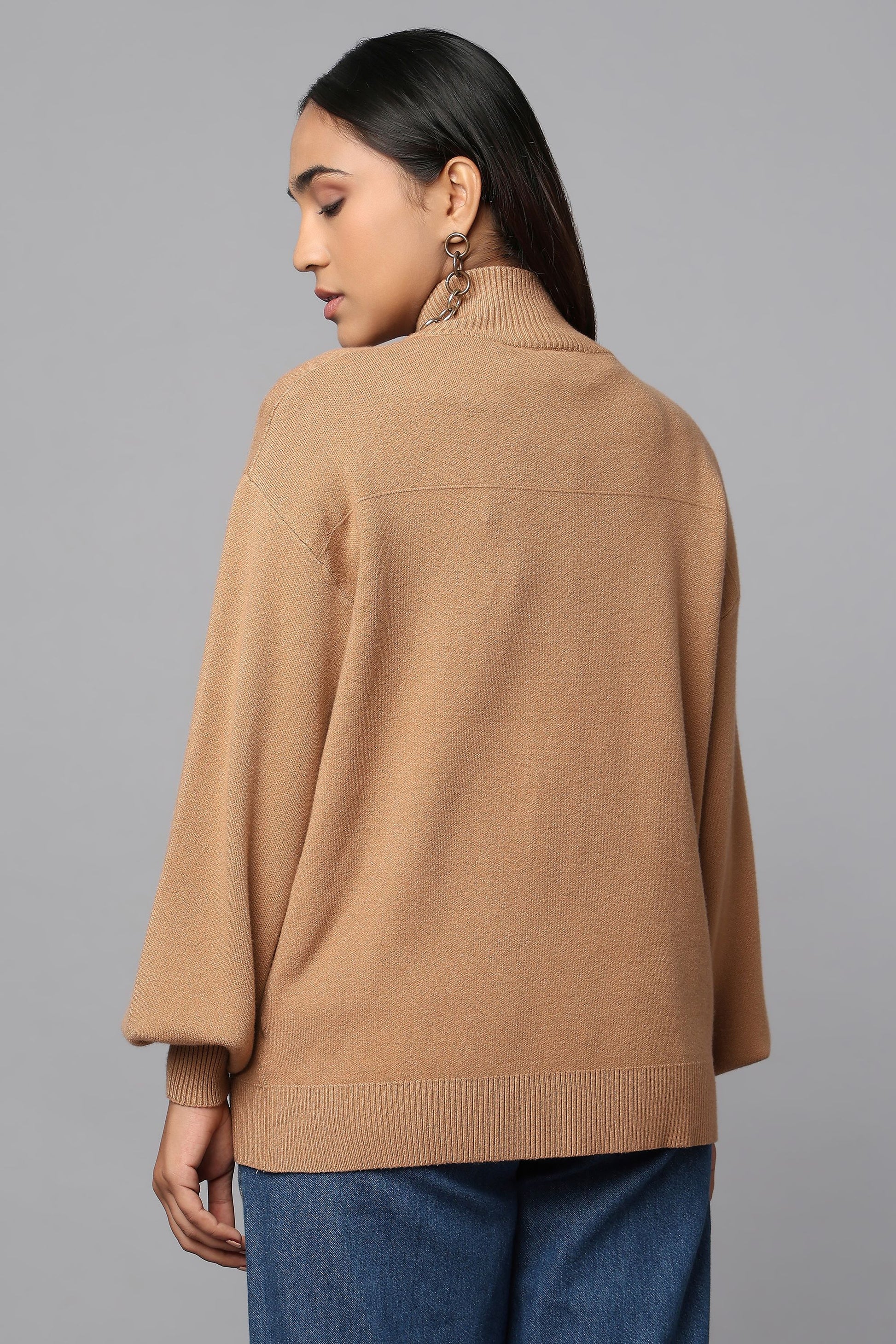 Elevate your winter wardrobe with this zip-up bomber-style sweater by TAMiSKA By Narendra Kumar. Designed for a relaxed yet polished look, it features statement quilted patch pockets with flap-button detailing and a structured stand collar. Crafted from a soft viscose blend knit, the silhouette is relaxed with a drop shoulder and voluminous sleeves, creating a laid-back yet elevated aesthetic. Whether you style it open over a tank or zipped up for a streetwear edge, this sweater makes for a trans-seasonal essential.